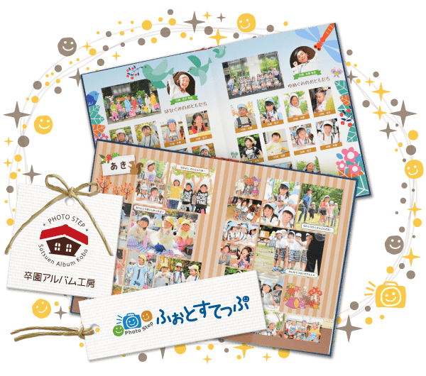 ふぉとすてっぷでは、保護者の方が中心となって卒園アルバムを作る際に、安心のサポート体制をご用意しています。Web上で簡単に操作できる編集ツールに加え、プロによる写真レタッチ、入稿チェック、登場回数の自動カウントなど、制作のさまざまなお悩みに丁寧に対応しています。さらに、園児の「将来の夢」イラストや人物の切り抜き加工など、子どもたちが笑顔になるようなデザインの工夫もたくさん。はじめてでも楽しく、安心して制作を進めることができます。保護者の手でつくる卒園アルバムを心に残るプロ品質で仕上げたいならぜひ、ふぉとすてっぷ・卒園アルバム工房にお任せください。