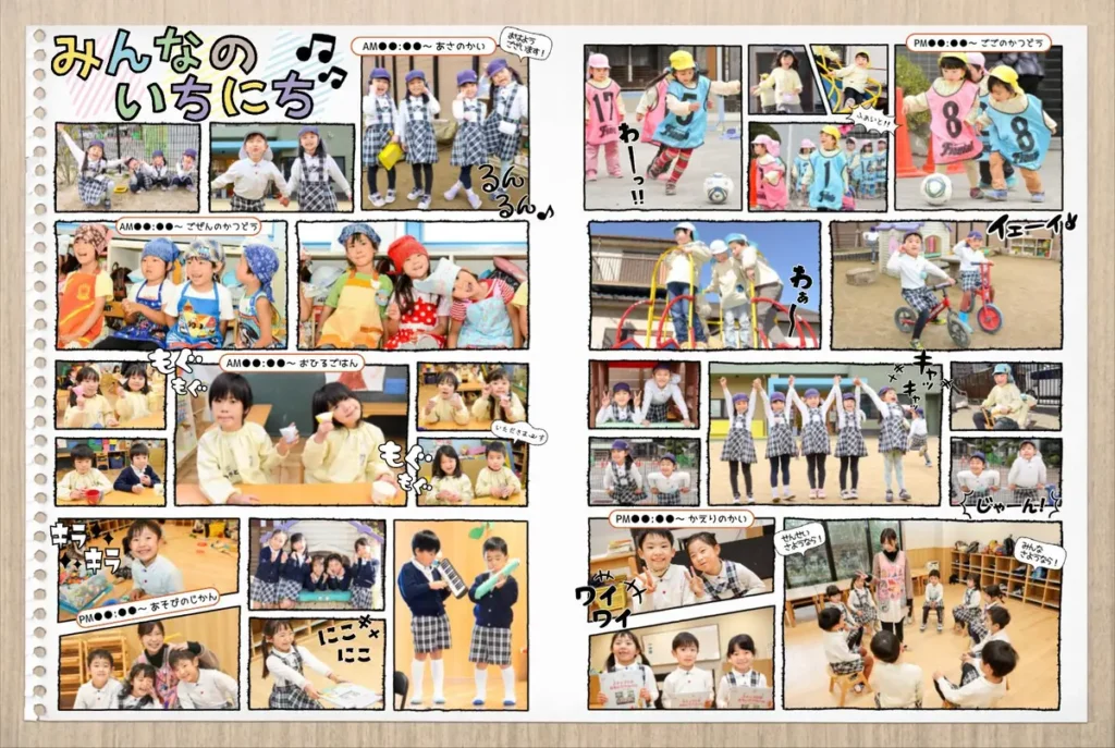 手書き風のフレームや吹き出し、季節のイラスト、将来の夢に合わせた着せ替え素材など、5,000点以上の装飾が揃っています。背景だけでなく、写真やメッセージのまわりに素材を加えることで、園児一人ひとりの表情や言葉がより印象に残るデザインに仕上がります。